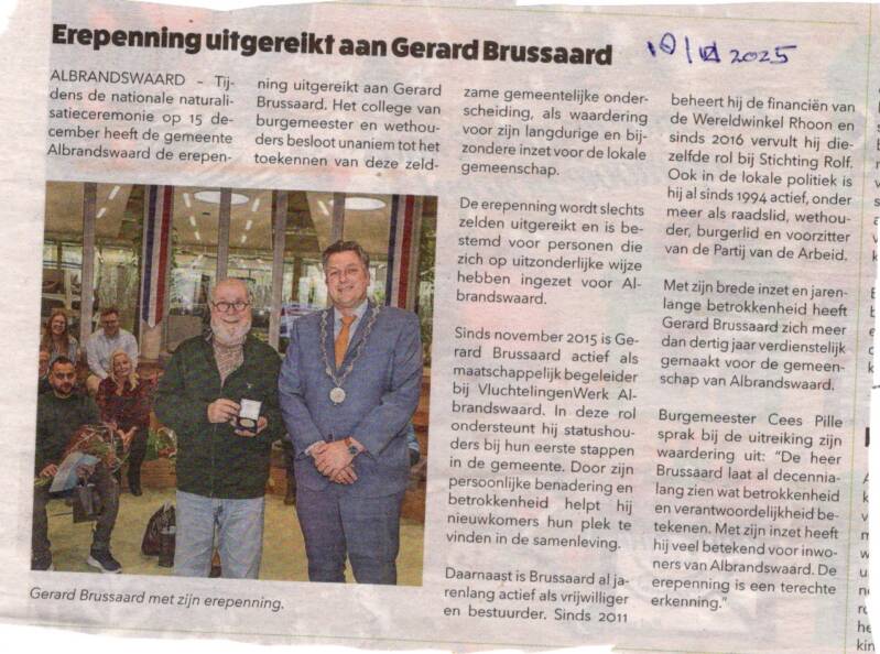 Op 15 december 2025 na de naturalisatie werd door burgemeester Cees Pille de erepenning van de gemeente Albrandswaard aan mij uitgereikt.